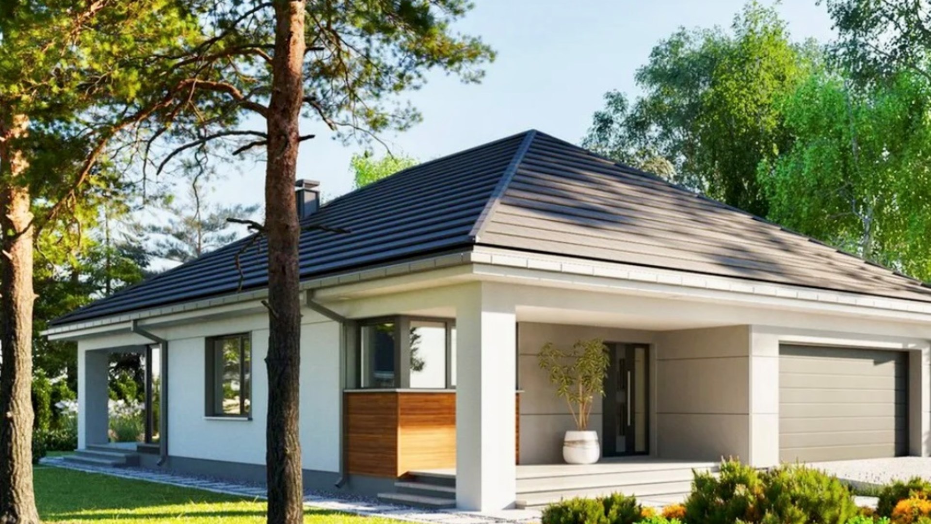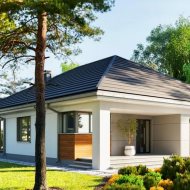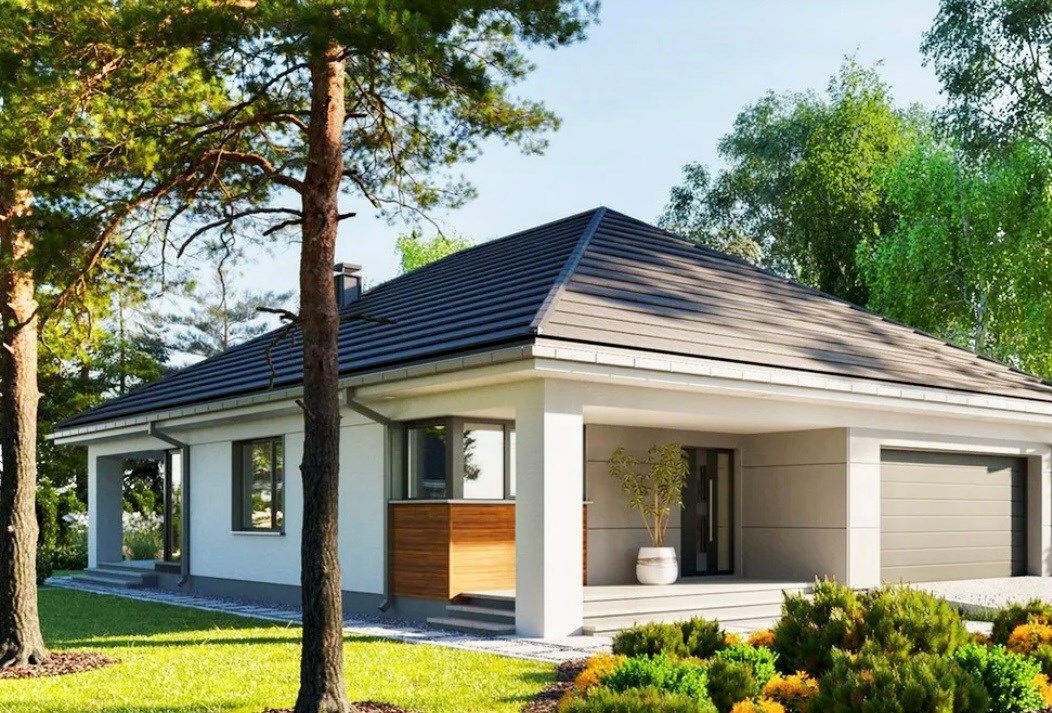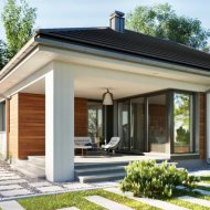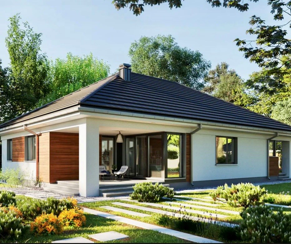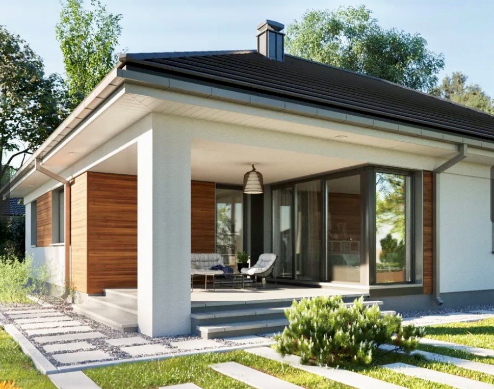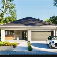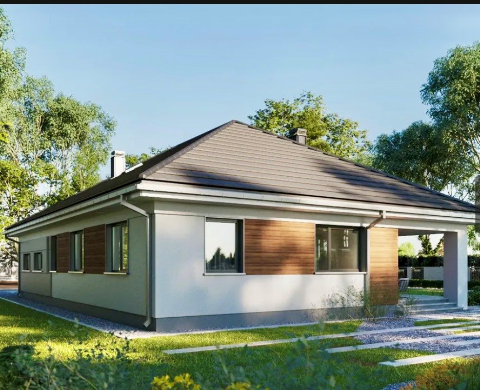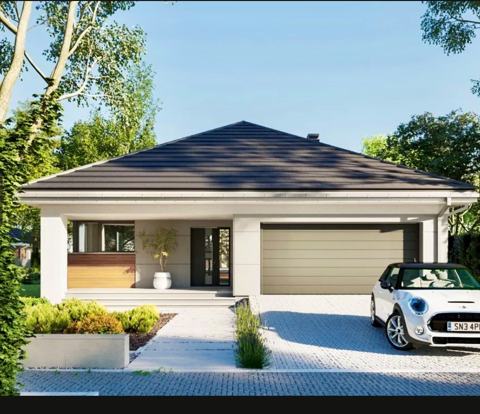 * Nowoczesna bryła: Estetyczna elewacja z elementami nawiązującymi do aktualnych trendów architektonicznych.
