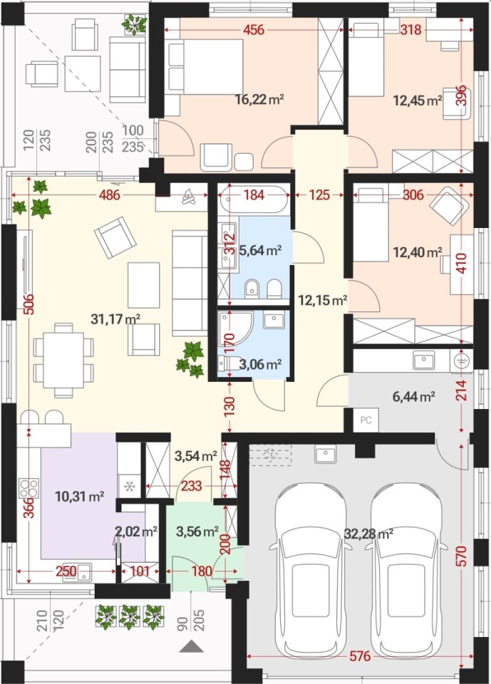* Garaż dwu stanowiskowy: W bryle domu
