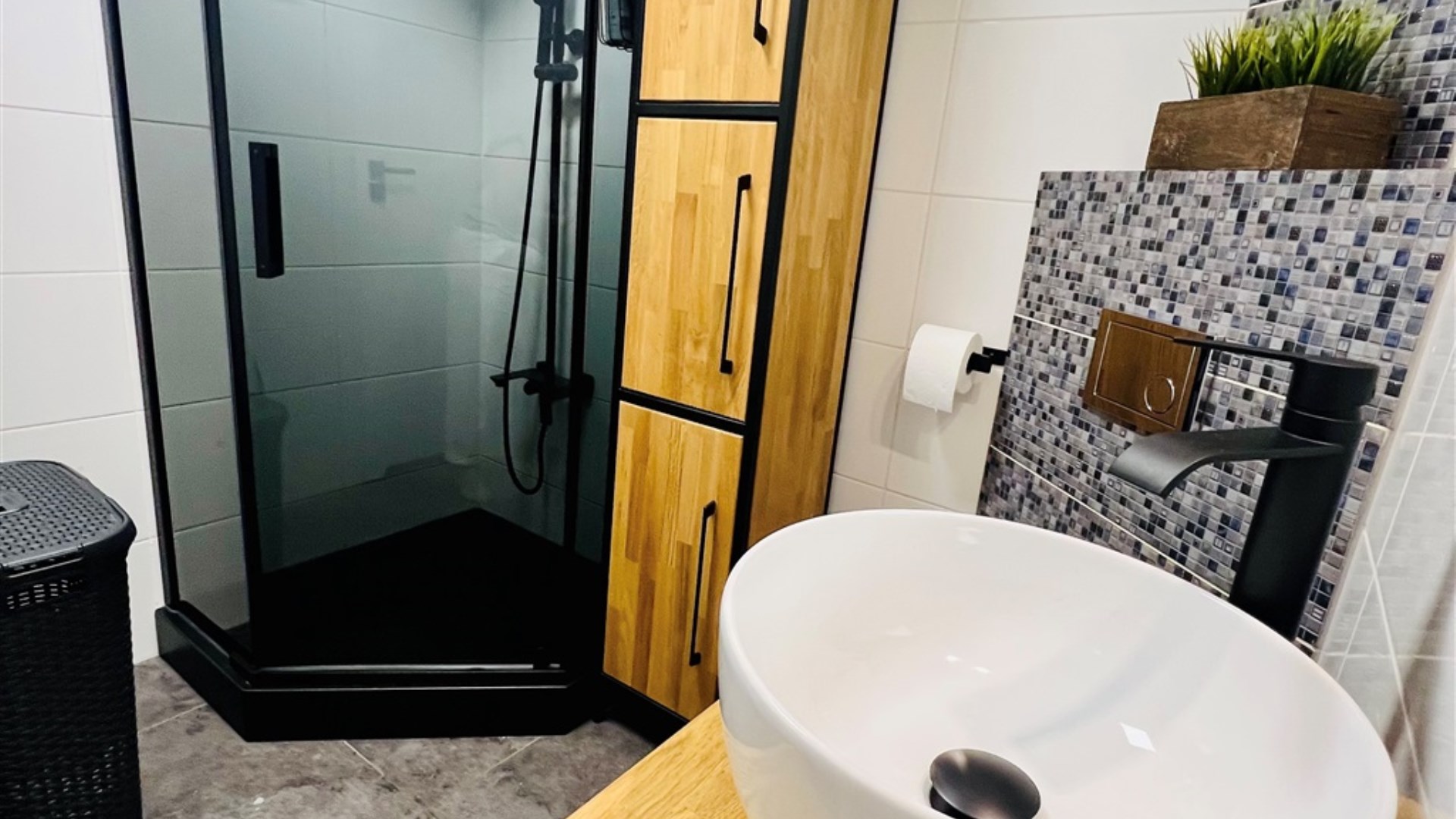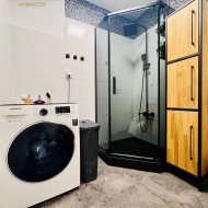 - nowoczesna duża łazienkę z prysznicem z wc wyremontowana w 2025r oraz pralką marki SAMSUNG,